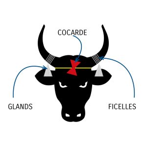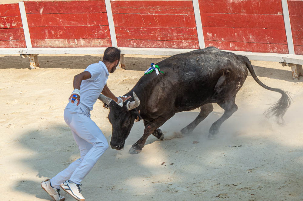 Au cœur de l’arène, les raseteurs, habillés de blanc, affrontent le taureau avec agilité et courage, cherchant à décrocher cocarde, glands et ficelles, attributs symboliques fixés entre les cornes du cocardier.