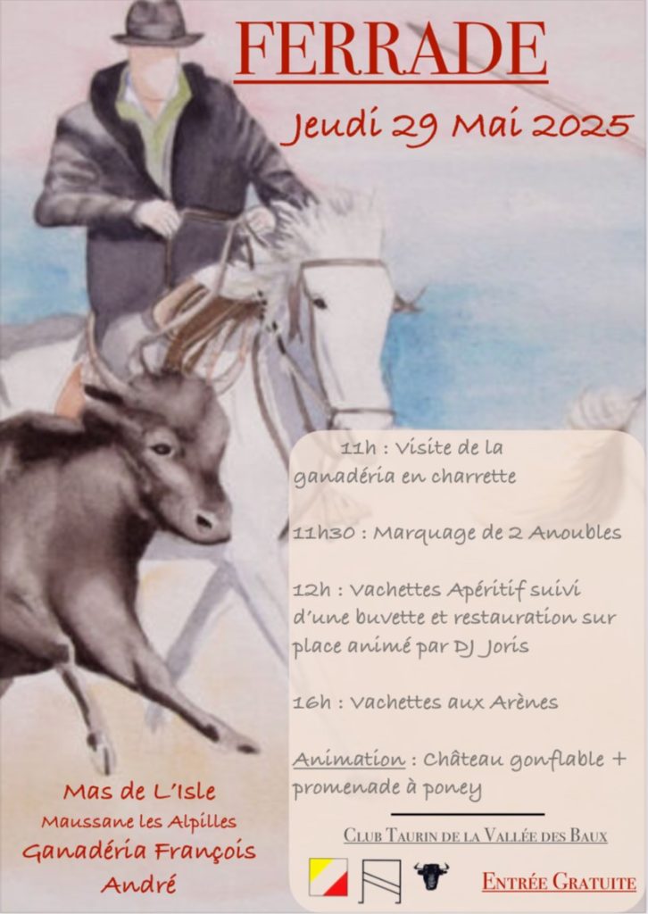 La ferrade, appelée fèdèro en occitan, constitue une tradition centrale dans la vie d’une manade. Il s’agit d’une cérémonie rurale au cours de laquelle on marque au fer rouge les jeunes taureaux ou chevaux, en présence d’un public et dans une ambiance festive.